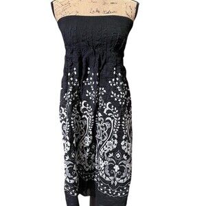 This MSK women’s XL strapless tube dress makes getting dressed feel effortless. The smocked, stretchy bodice stays comfortably in place while the lightweight woven fabric adds a subtle shimmer that looks amazing in the sun or under evening lights. A flowy knee-length skirt and bold black-and-white floral paisley border print bring instant polish—just add sandals for vacation or heels for a party, dinner, or evening out. Condition: pre-owned.