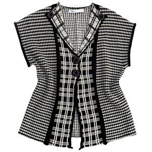 This Skovhuus knit sweater features a striking black‑and‑white pattern combining houndstooth and plaid motifs, arranged in a paneled design across the body and sleeves. The silhouette includes a V‑neckline, short sleeves, and a three‑button front, creating a structured, tailored look typical of Scandinavian knitwear.