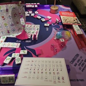 166 Tiles American Mahjong set. Champagne bottles are craks, Disco balls are dots and martini glasses are Bams with a cute Flamingo as Birdie Bam, and champagne bottles with wrap around Dragons. Includes matching bag and tile with fringe Keychain attachment. Perfect for holiday, birthday, or any celebration and engaging play. Brand new in original packaging.