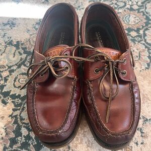 Classic dark brown leather boat shoes by Sperry. Ideal for casual wear. Durable and stylish. In good condition, please see slight wear on soles shown in picture.