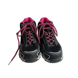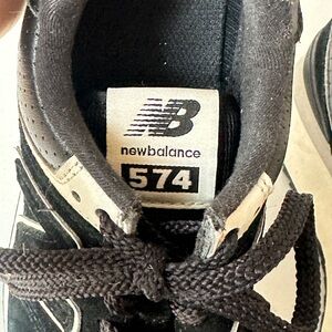 New Balance 574 sneakers. Black with white accents. Stylish platform design.