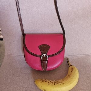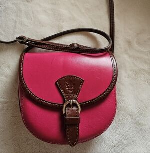 Chic and stylish muave leather crossbody bag with brown accents. Perfect for any occasion.