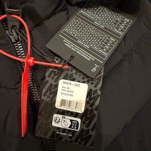 Elegant charcoal puffer coat by Mackage. Features a luxurious fur-trimmed hood. Ideal for winter warmth and style.
