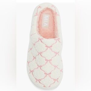 Experience comfort with MIA's soft pink and cream slippers. Ideal for relaxing at home.