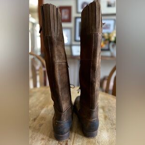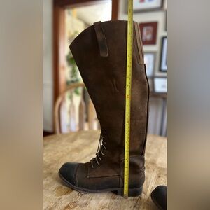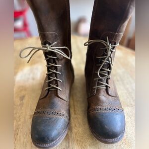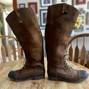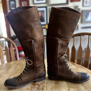 Stylish brown leather knee-high boots with lace-up and zipper details. Perfect for a chic look. See all photos for descriptions. There are small marks or scuffs from normal wear. These boots are gorgeous! Sadly my calves are too big. Great condition.