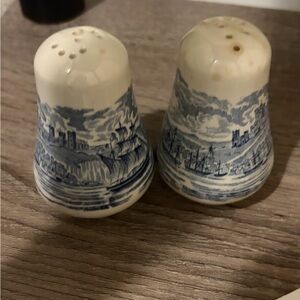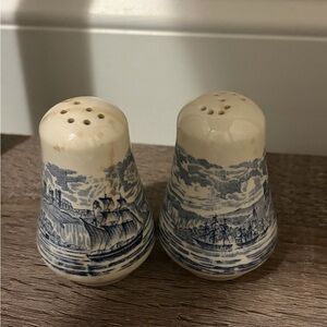 Vintage Historical Ports of England Blue Transferware Salt & Pepper Shakers - Nautical Sailing Ship Motif