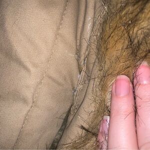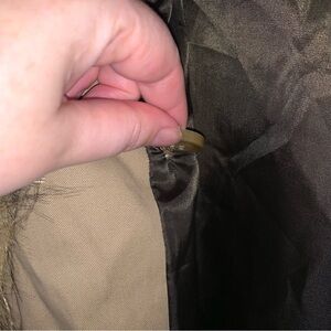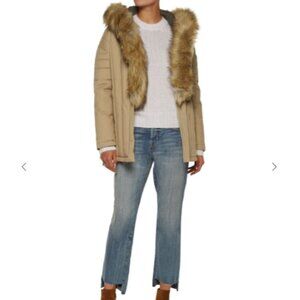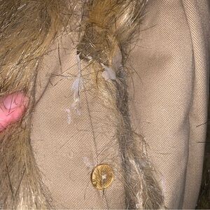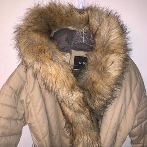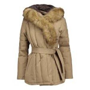 Stylish tan jacket with luxurious fur trim. Belted waist for a flattering fit. Perfect for cold weather.
