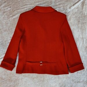 Classic and elegant jacket and skirt set in bright red color made with the classic St. John signature knit fabric.