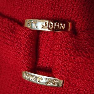 The jacket has four gold tone St. John buttons in the front and back waist band with gold tone St. John buckle. The sleeves have fold cuffs.