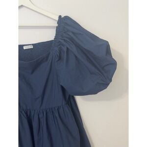 Chic Soul babydoll dress in a deep navy blue hue features a voluminous silhouette with dramatic puff sleeves and a tiered skirt. Crafted from a crisp polyester fabric, this piece includes a square neckline and a smocked back panel for a comfortable, flexible fit. The short puff sleeves add a romantic, cottagecore-inspired touch to the overall playful design.