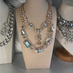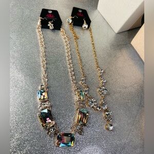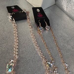 Paparazzi necklace bundle two necklaces each necklace has its own set of matching earrings. Attached this bundle comes with a total of 4 items two necklaces and two matching earrings attached Shimmering gold and rose gold tones in intricate design. Features sparkling iridescent rhinestone crystal accents. Ideal for glamorous events.