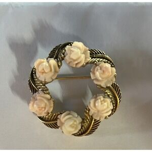 Gold Tone Wreath Brooch White Rose Leaf Vtg Pin Women Whimsical Floral Flower