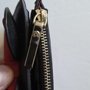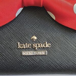 Charming Kate Spade wallet featuring a striking red bow with white polka dots. Perfect for adding a playful touch to your collection. Small snag on the inside.
