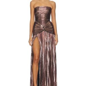 Stunning strapless maxi dress. Features a metallic bronze finish. Elegant side slit for added allure. Worn only once for a wedding and got so many compliments! Open to fair offers 😊