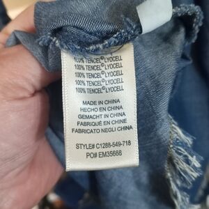 Features soft, comfy fabric of 100% lyocell, button up front with v-neck and collar. Has a high-low curved hemline, long sleeves with raw edges at the button cuffs and hemline. Front chest pockets.