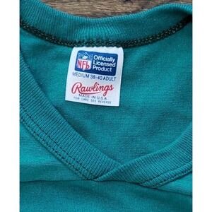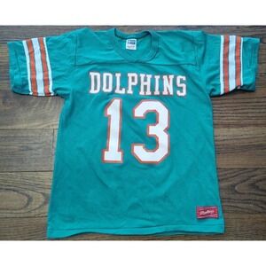 The Vintage Rawlings Dan Marino #13 NFL Miami Dolphins T Shirt is a retro sports apparel piece that pays homage to the legendary football player. Made in the USA, this officially licensed shirt features the iconic aqua color of the Miami Dolphins and is perfect for any unisex adult fan of the team. With a Super Bowl event/tournament theme, this shirt is a must-have for any Dan Marino or Miami Dolphins enthusiast looking to represent their favorite team in style.