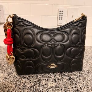 Neon pink camera bag with bold black strap. Features signature Marc Jacobs logo. Scratch on top of logo reflects discounted price. Additional hot pink Marc Jacob’s strap included.