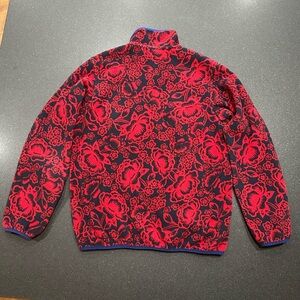 Vibrant Patagonia fleece with red floral design. Blue accents add contrast. Ideal for casual outings.