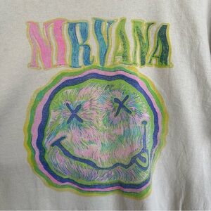 Nirvana graphic band tee in size XL featuring a tan base with a bold tie dye logo design. Made from 100% cotton with a comfortable loose fit for that relaxed, laid-back look.