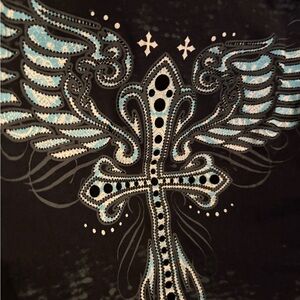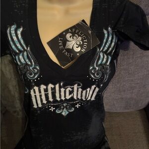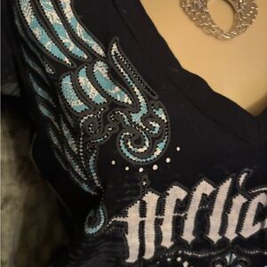 Bold Affliction tee with striking wing graphics. Black base with blue accents. Perfect for a standout look.