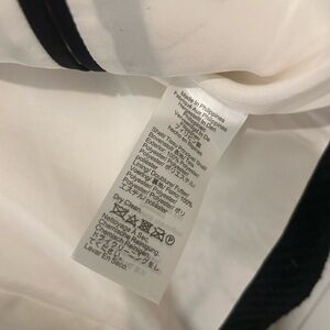 Elegant white jacket with black trim. Features gold buttons. Ideal for formal occasions.