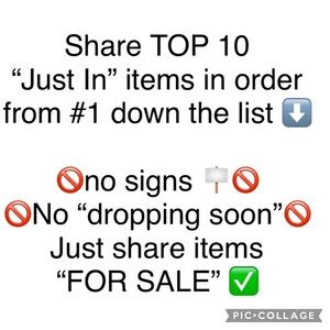 4) Share the TOP 10 under “JUST IN” (please NO SIGNS 🪧, trip photos, frequent buyer club signs etc) for each posher who signs in (📌 NO “random” request: this is a quick filter & share group) ⭐️
