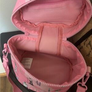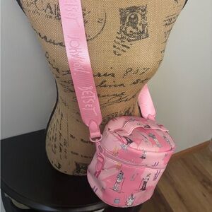 Chic pink crossbody with playful illustrations. Perfect for adding a fun touch to any outfit.