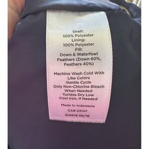 Talbots Plus navy blue puffer vest features a classic quilted design with a mix of horizontal and chevron patterns for a flattering silhouette. This sleeveless outerwear piece includes a full-zip front, a high stand-up collar, and side pockets with snap-button detailing at the hips. The back is designed with an elasticized waist for a tailored fit. Insulated with a blend of down and waterfowl feathers, it provides lightweight warmth perfect for layering.