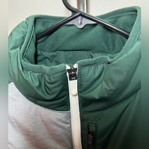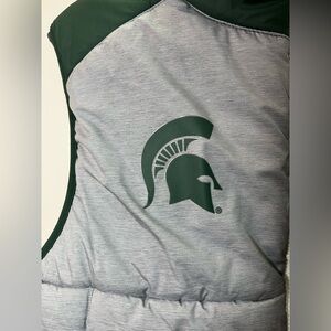 Excellent condition Nike puffer vest. Green and gray colorblock design with Michigan State Spartans logo. Lightweight insulated, full zip closure, zip chest pocket. Size: L Approx measurements (flat): • Width: 22 in • Length: 28 in