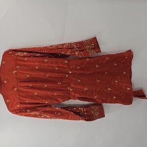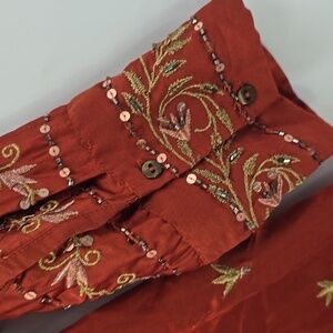 Chic wrap dress with delicate embroidery. Stunning terracotta hue. Ideal for stylish events.