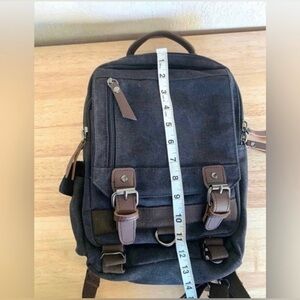 Canvas style material with brown faux leather trim and multiple pockets for organization. Perfect everyday backpack, travel bag, or casual daypack.