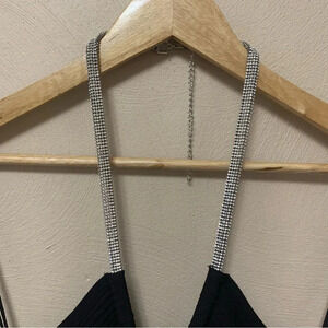 The Sadira Dress in Black. Sleek and ultra-arresting midi length dress with diamante embellished halter straps that meet a deep v neckline, crafted from slimming compact rib.