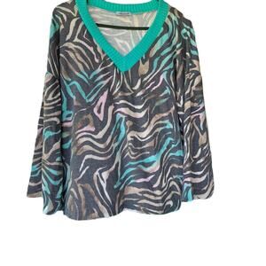Body of shirt is cream in color with teal and copper design and copper colored sleeves.