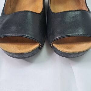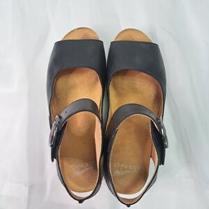 Dansko Tiana Peep-Toe Wedge Sz 37 Black Burnished Calf Leather Boho Chic Modern