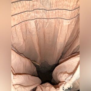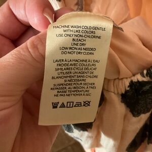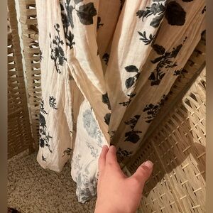 Gorgeous Free People dress in perfect condition. Relaxed short cap sleeves, feminine bow tie back, side slit and a half slip lining. Color is peach with dark gray and black flowers. Fabric is 100% cotton with a 100% viscose (bamboo) lining. Airy, light, and feels wonderful on. Women’s size small-but with stretch and would definitely fit a medium.