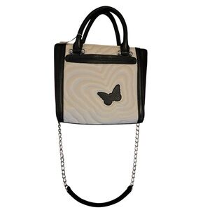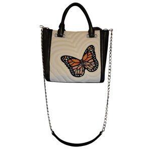 This stylish handbag features a beautiful butterfly embroidery, perfect for adding a touch of elegance to any outfit. The black and white design is complemented by a striking orange butterfly, making it a standout accessory.