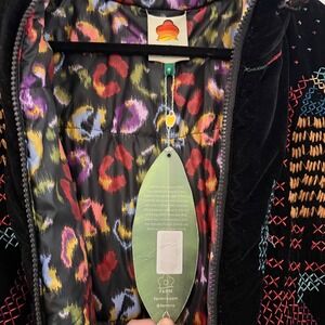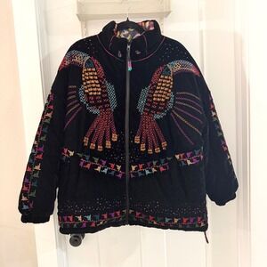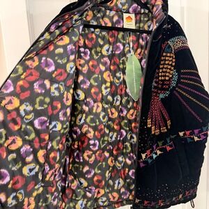 Farm Rio Black Embroidered Reversible Puffer Jacket Toucan Velvet Medium NEW