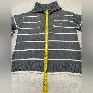 Chic grey sweater with white stripes. Features a zip-up front and cozy collar. Perfect for layering.