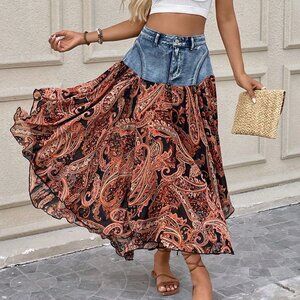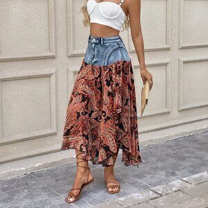 A medium wash denim skirt in boho style offers a relaxed, flared silhouette with a natural mid‑waist line. The regular fit and long, mid‑length cut create a flowy look that works with casual tees, layered tops, or dressier blouses. Soft denim provides easy movement while the timeless wash adds effortless charm, making it a versatile addition for everyday outfits.