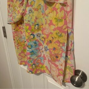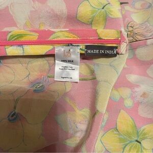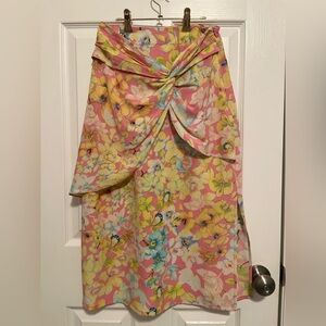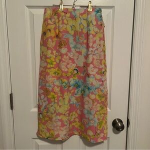 New condition! Absolutely stunning LA FUORI silk midi skirt in a vibrant pink base with bold yellow and blue florals. Features a flattering high-rise fit with elegant twist-front draping detail and a chic side slit for beautiful movement. The 100% silk fabric gives it a lightweight, luxe feel — perfect for spring events, weddings, brunch, or vacation evenings.