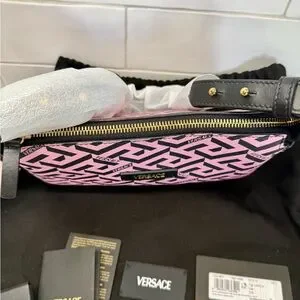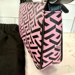 Versace La Greca Signature Shoulder Bag Pink Black Canvas Gold Metal Authentic