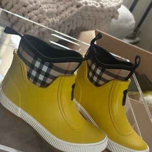 Stylish yellow rain boots for kids. Features iconic Burberry check pattern. Durable and waterproof.