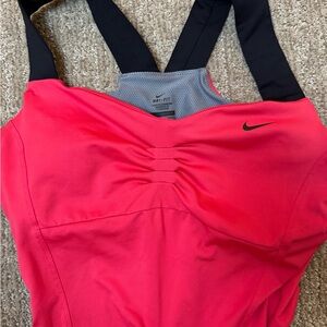 Bold red tank top with stylish black straps. Ideal for active wear. Rushed front in bustline. Strappy back and slightly longer with a bit aline bottom. Good bra, supportive. Nike size medium