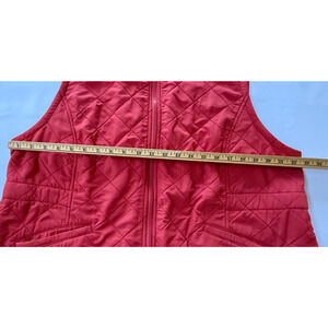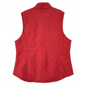 Bit & Bridle Women’s 1X quilted vest in a rich brick red color, in gently used, good condition. This cozy layer is made from 100% polyester with a soft fleece lining for warmth without too much bulk. Features a gold front zipper, quilted pattern, and pockets for everyday practicality. Machine washable and easy to care for, perfect over long sleeves or sweaters for fall and winter.