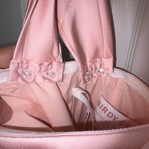 New With Tags Birdy Grey blush pink satin midi dress with an elegant draped cowl neckline and flowy skirt. Perfect for bridesmaids, weddings, cocktail events, proms or formal occasions. Beautiful timeless shade that photographs perfectly.