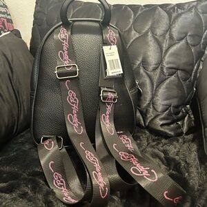 Stylish backpack with signature skull pattern. Features bold black and pink design. Ideal for making a statement.