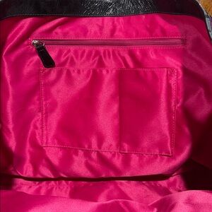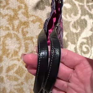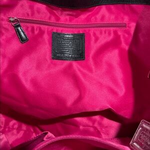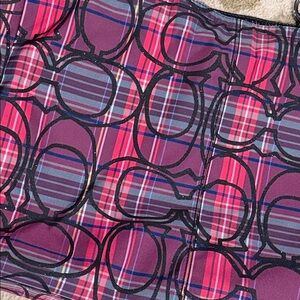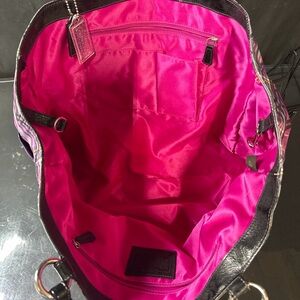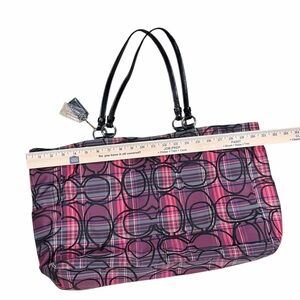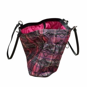 Stylish and spacious Coach carryall tote bag featuring the signature outlined “C” print over a vibrant pink and purple tartan plaid nylon. Finished with black patent leather trim and straps and silver-tone hardware.
