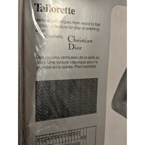 Vintage Christian Dior Tailorette hosiery features a sophisticated vertical pinstripe texture from waist to toe, designed for a classic look that transitions seamlessly from day to evening. These sheer tights in the shade Plum Violet offer a sandalfoot finish, making them suitable for open-toe shoes. Made in the USA from 100% nylon, they provide a refined aesthetic with a subtle patterned detail.