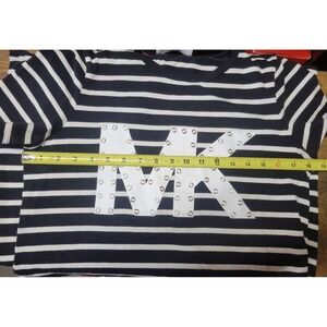 Command attention in this chic Michael Kors dress, a captivating blend of comfort and style. Bold black and white stripes create a striking visual impact, while the iconic 'MK' logo, embellished with metallic studs, adds a touch of edgy glamour. The classic short-sleeve silhouette and comfortable fit make it effortlessly wearable. Perfect for a casual brunch with friends, a stylish day of shopping, or a relaxed evening outing.