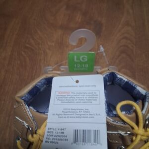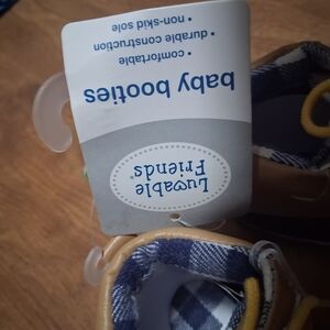 Charming baby walker shoes with tan and blue design. Perfect for little explorers. Durable and comfy.